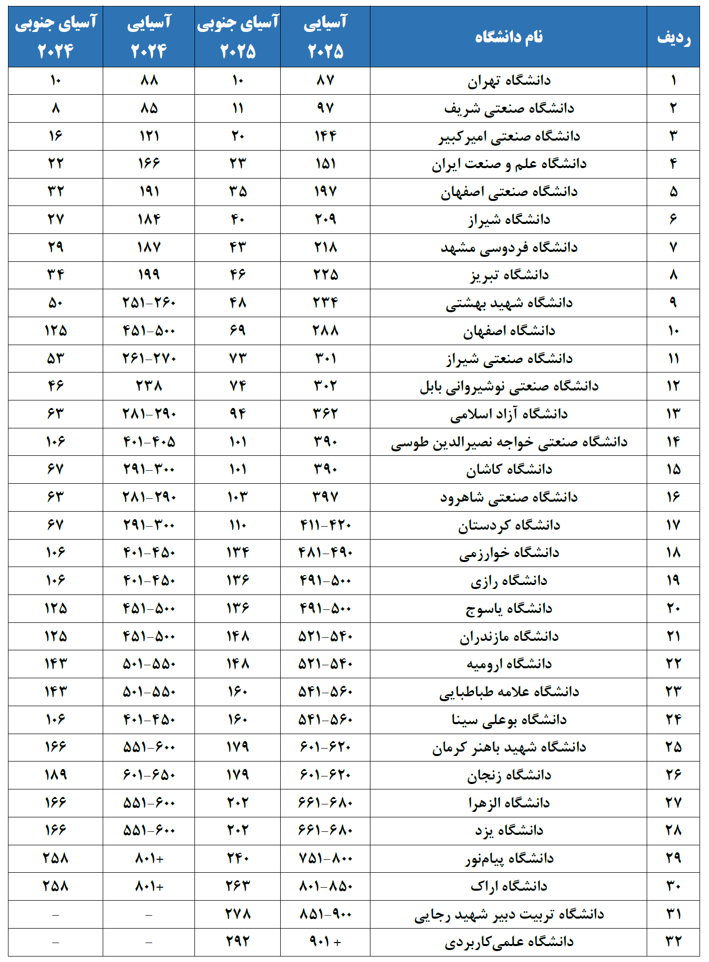 در رتبه بندی کیو اس آسیایی ۲۰۲۵، ۹۸۴ دانشگاه آسیایی حضور دارند و دانشگاه Peking از کشور چین با کسب رتبه اول، به عنوان بهترین دانشگاه آسیایی در این رتبه بندی حضور دارد. دانشگاههای تهران، صنعتی شریف و صنعتی امیرکبیر به ترتیب با کسب رتبه ،87، 97 و 144 دانشگاه های اول تا سوم ایران هستند و دانشگاه صنعتی شیراز با کسب رتبه 73 آسیای جنوبی و 301 آسیا در رتبه 11 دانشگاه های کشور قرار گرفته است.