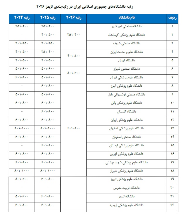 لازم به ذکر است که در جدول دانشگاه هایی که رتبه بندی آنها در بازه یکسان هستند همگی هم رتبه بوده و ترتیب اسامی ذکر شده در این گزارش مطابق با سامانه رتبه بندی تایمز و بر اساس حروف الفبا (به لاتین) است.